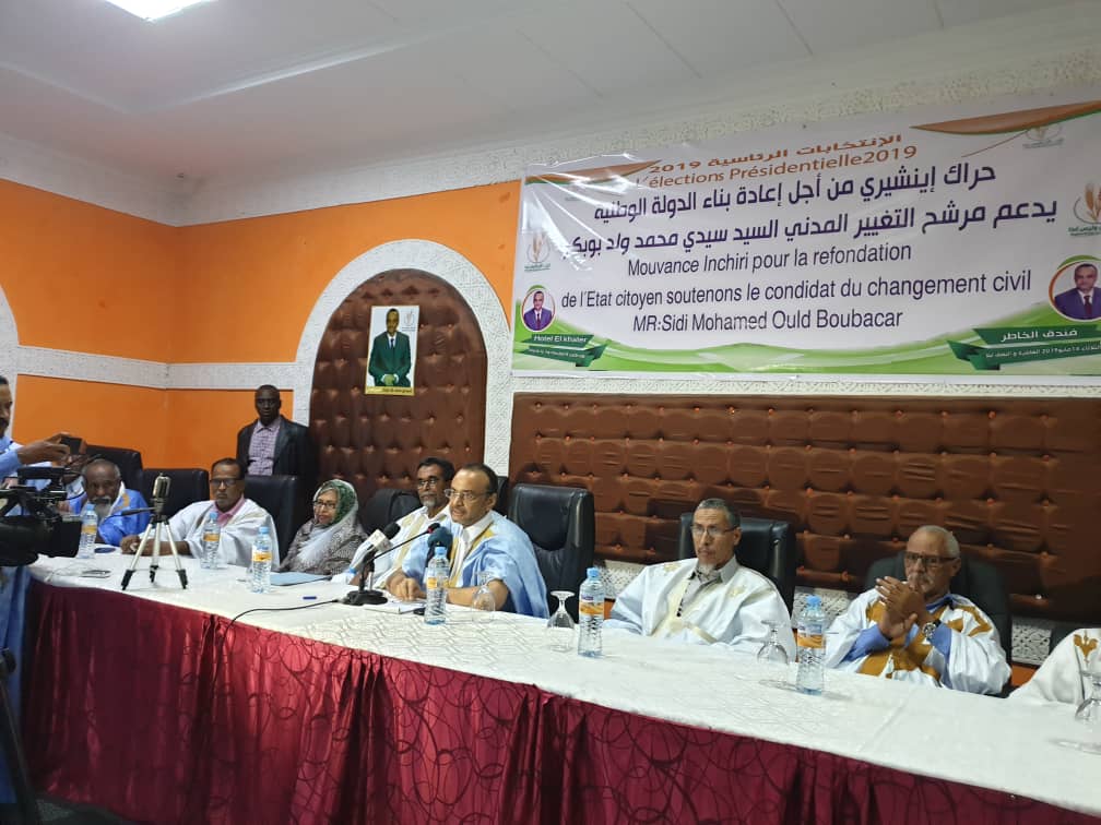 أعلن حراك إنشيري من أجل بناء الدولة الوطنية دعمه للمرشح سيدي محمد ولد بوبكر وذلك في تظاهرة سياسية احتضنها فندق الخاطر مساء الثلثاء 14 مايو 2019 وحضرها مرشح التغيير. وقال محمد يحي ولد صمب رئيس الحراك إن المجموعة المنحدرة من ولاية إنشيري تهدف من خلال دعم مرشح التغيير المدني إلى …