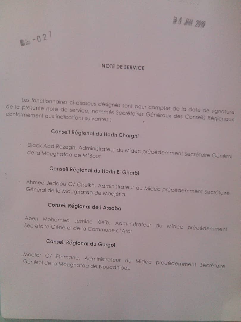 أصدرت وزارة الداخلية مذكرة تتضمن تعيين الأمناء العامين للمجالس الجهوية في جهات البلاد الاثني عشر وذلك بعد أربعة أشهر من انتخاب هذه المجالس لأول مرة في تاريخ البلاد. التعيينات اقتصرت على إداريين في وزارة الداخلية وكانت من بينهم امرأة واحدة. ففي نواكشوط تم تعيين الإداري أحمد ولد كبادي أمينا عاما …