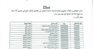 دعت وزارة الصحة 22 من الوكلاء العقدويين بالقطاع للالتحاق بأماكن عملهم خلال 72 ساعة. وأصدرت الوزارة لائحة بأسماء المعنيين، مؤكدة أن البلاغ يحل محل إنذار. وكانت وزارة الصحة قد أصدرت بلاغا مماثلا قبل فترة، مهددة عشرات الموظفين بالفصل من العمل في حال عدم الالتحاق بأماكن عملهم.