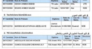 أعلنت إدارة المصادر البشرية بشركة اسنيم لائحة المترشحين الناجحين في مسابقة اختيار الطاقم شبه الطبي. ودعت المعنيين للحضور إلى مركز التكوين المهني بانواذيبو، في أجل أقصاه 03 فبراير 2025، من أجل إكمال إجراءات الاكتتاب، مصحوبين بتكملة ملفاتهم التي تتكون من: – سيرة ذاتية محدثة – 4 صور شمسية؛ – مستخرج …