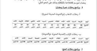 أعلنت شركة الموريتانية للطيران، عن برنامج رحلاتها الخاص بالحج وبعمرة رمضان لموسم 1446 / 2025. وقالت الشركة في بيان صادر عنها إن رحلات الذهاب من نواكشوط إلى المدينة المنورة بالنسبة للمعتمرين ستبدأ يوم الأربعاء الموافق 26 فبراير، على أن تنتهي في 23 من مارس بمعدل رحلات متفاوت في كل أسبوع. …