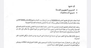 نشرت وزارة الصحة اليوم تعميما صادرا عن وزيرها يتعلق بتطبيق انشاء نظام المداومة والإلزام لموظفي ووكلاء الصحة العاملين بالمنشآت الصحية العمومية. ويلزم التعميم بالتطبيق الصارم لنظام المداومة والحضور الدائم بالمصالح الصحية . وشدد البيان أنه غير مسموح بالتمالؤ أو عدم احترام المداومة والإلزام وأن أي عدم التزام بذلك يعرض صاحبه …