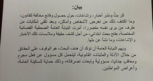 أعلنت النيابة العامة بولاية نواكشوط الغربية فتح بحث ابتدائي، من أجل كشف “حقيقة” ما يُثار حول حصول وقائع “مخالفة للقانون”. وأضافت النيابة في بيان لها أن البحث يأتي بفعل تلقيها لشكايات من طرف من يرى نفسه متضرّرا، وما حدث من “تعرض” لأشخاص وأماكن. وأكدت النيابة أن هدف البحث، هو الوقوف …