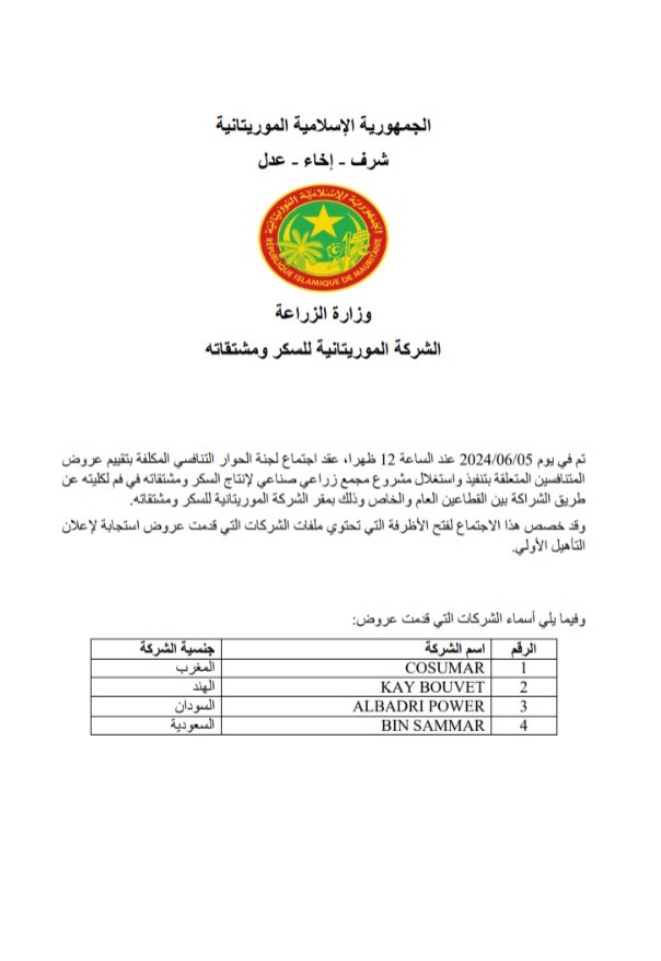 تتنافس أربع شركات دولية للفوز بإنشاء مشروع مجمع زراعي صناعي لإنتاج السكر ومشتقاته في منطقة فم لكليته بولاية كوركل. وتقدمت أربع شركات دولية بعروض للتنافس للفوز بهذه المشروع، والذي يقام بالشراكة بين القطاعين العام والخاص، وهذه الشركات هي: • COSUMAR وهي شركة مغربية. • KAY BOUVET وهي شركة هندية. • …