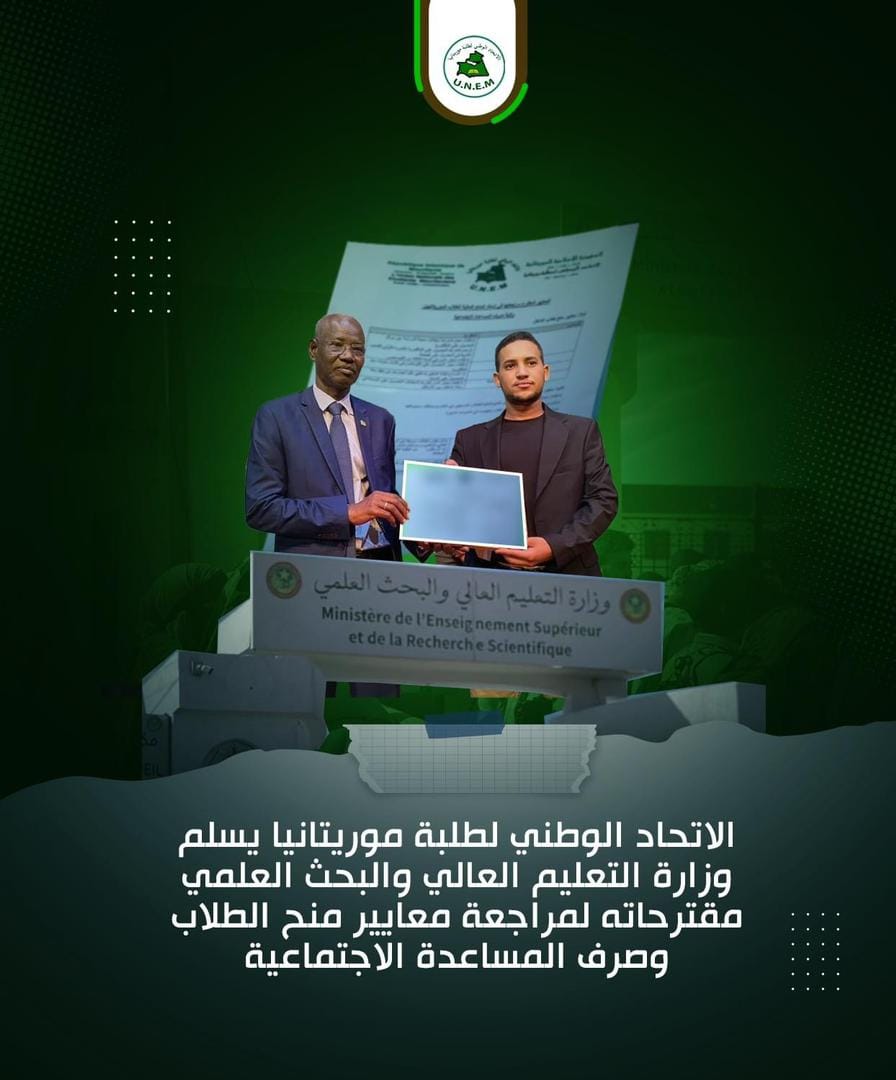 سلّم الأمين العام للاتحاد الوطني لطلبة موريتانيا محمد يحيى المصطفى وزير التعليم العالي انيانغ مامودو أمس الإثنين بمقر وزارة التعليم العالي والبحث العلمي مقترحات الاتحاد لمراجعة معايير إسناد منح الطلاب الموريتانيين في الداخل والخارج، وآليات ومحددات صرف المساعدة الاجتماعية للطلبة غير الممنوحين. ويدخل هذا المقترح في إطار الاتفاق الأخير الموقع …