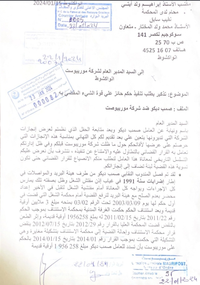 طالب المحامي إبراهيم ولد أبتي إدارة موريبوست بتنفيذ حكم صدر للعامل والنقابي صمب ديكو المفصول من المؤسسة سنة 1991، مطالبا الإنصياع للقرار القضائي، حتى تكون هذه القضية لبنة تضاف إلى إنجازات المؤسسة، وفق تعبيره. وقال ولد أبتي في رسالة موجهة إلى الوزير الأول وبعض الوزارات الوصية، والهيئات ذات الصلة بالموضوع …