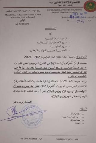 أصدر وزير التهذيب الوطني المختار ولد داهي، تعميما يقضي بتمديد السنة الدراسية شهرا كاملا حتى نهاية يونيو 2024. وحسب التعميم فإن الدروس يجب أن تواصل إلى غاية 29 يونيو 2024، على أن تنظم الامتحانات الوطنية في شهر يوليو. وحسب نص التعميم فإن القرار جاء “تصحيحا للاختلالات في المادة 62 من …