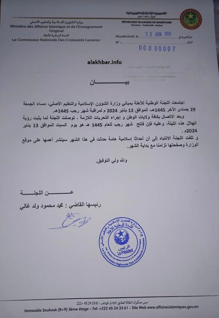 أعلنت اللجنة الوطنية للأهلة أن السبت هو فاتح شهر رجب من العام الهجري 1445، وذلك بعد توصلها بما يثبت رؤية الهلال الليلة. وأكدت اللجنة في بيان صادر عنها أنها توصلت لهذه النتيجة بعد الاتصال بكافة ولايات الوطن وإجراء التحريات اللازمة. وعقدت اللجنة اجتماعها الليلة بمباني وزارة الشؤون الإسلامية والتعليم الأصلي …