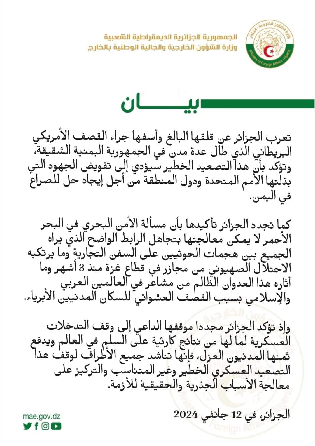 عبرت الجزائر عن قلقها وأسفها جراء القصف الأمريكي البريطاني لعدة مدن يمنية. وأكدت بيان لوزارة الشؤون الخارجية الجزائرية أن هذا التصعيد سيؤدي إلى “تقويض” الجهود التي بذلتها الأمم المتحدة ودول المنطقة من أجل إيجاد حل للصراع في اليمن. كما أكدت على أن مسألة الأمن في البحر الأحمر لا تمكن معالجتها …