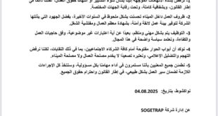 أصدرت شركة “Sogetrap” العاملة في ميناء نواكشوط المستقل، بيانًا توضيحيًا ردًا على ما وصفته بـ “الاتهامات والمعلومات غير الدقيقة” التي وردت في بيان للكونفدرالية الوطنية لعمال موريتانيا (CLTM) يوم 3 أغسطس الجاري، والمتعلق بتسيير اليد العاملة في الميناء. وأكدت الشركة، في بيانها الصادر بتاريخ 4 أغسطس 2025، رفضها التام للاتهامات …