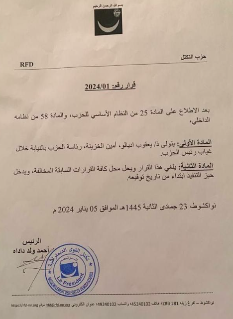 وقع رئيس حزب تكتل القوى الديمقراطية أحمد ولد داداه قرارا يقضي بتولي القيادي وأمين الخزينة يعقوب ديالو رئاسة الحزب بالنيابة خلال غيابه. ونصت المادة الثانية من القرار الذي حمل رقم: 01/2024 على أنه يلغي ويحل محل كافة القرارات السابقة المخالفة، ويدخل حيز التنفيذ ابتداء من تاريخ توقيعه. وغادر ولد داداه …