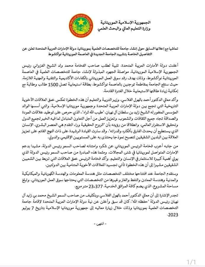 قالت وزارة التعليم العالي والبحث العلمي، إن جامعة التخصصات العلمية التي تتولى تمويلها دولة الإمارات العربية المتحدة، سيتم تشييدها في مقاطعة توجنين بالعاصمة نواكشوط. وأكدت الوزارة في إيجاز صحفي صادر عنها مساء اليوم الثلاثاء، أن مشروع الجامعة الذي يضم كافة المرافق الخدمية تبلغ مساحته 23377 متر مربع بطاقة استيعابية تصل …
