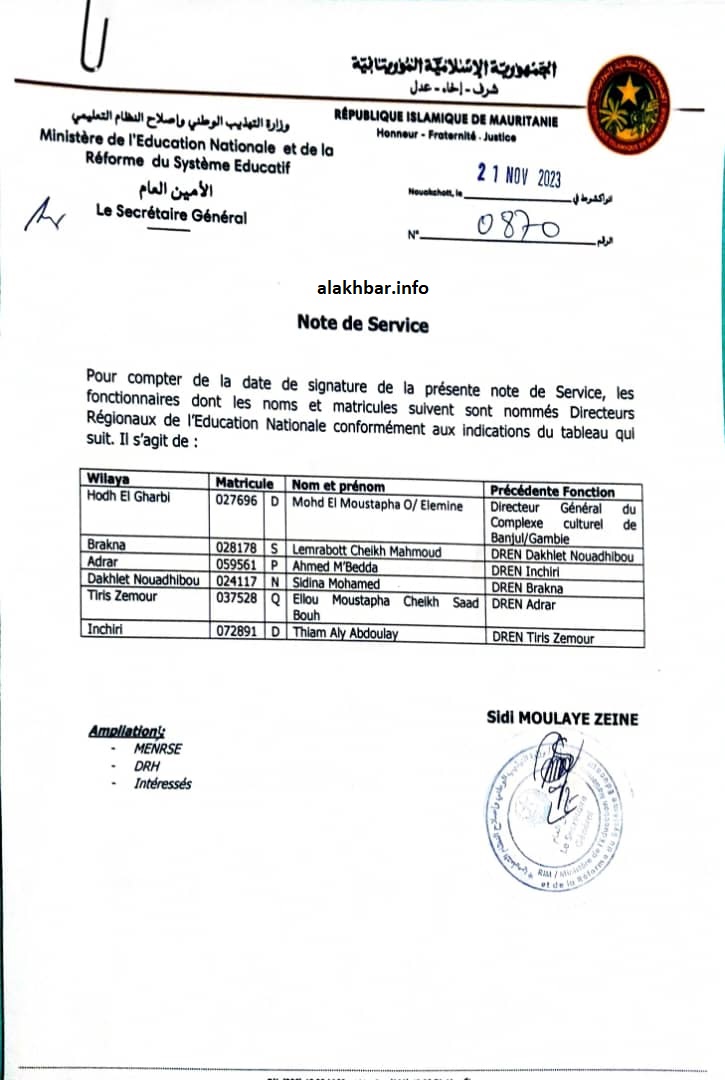وقع الأمين العام لوزارة التهذيب الوطني وإصلاح النظام التعليمي سيدي ولد مولاي الزين أمس الثلاثاء مذكرة أجرى بموجبها تغييرات في صفوف المديرين الجهويين للتعليم، كما وقع مذكرة أخرى عين بموجبها مديرا عاما للمجمع الثقافي الموريتاني في غامبيا. وبموجب هذه المذكرة عين: – محمد المصطفى محمد الأمين مديرا جهويا للتعليم في …