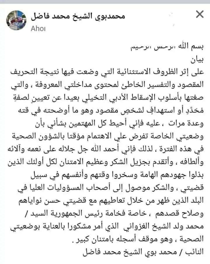 أكمل القراءة »النائب محمد بوي: أشكر الرئيس ووضعيتي الخاصة تقتضي التفرغ للشؤون الصحية