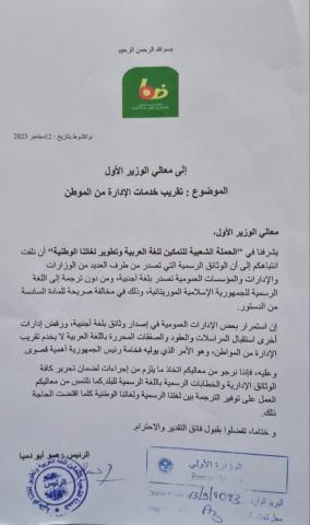 إيجاز صحفي وجهت الحملة الشعبية للتمكين للغة العربية وتطوير لغاتنا الوطنية اليوم 13 سبتمبر 2023 رسالة إلى معالي الوزير الأول تدعو فيها إلى تقريب خدمات الإدارة من المواطن من خلال تفعيل المادة السادسة من الدستور الموريتاني، وذلك بعد أن لاحظت استمرار بعض الوزارات والإدارات والمؤسسات العمومية في إصدار وثائق رسمية …