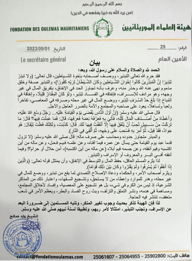 دعت هيئة علماء موريتانيا إلى “التصدي لما يقع من تبذير، ووضع للمال في غير محله، وهدر الموارد وإعطاء من لا يستحق، وتشجيع السفهاء”. ووصف بيان صادر عن الهيئة هذه المظاهر بأنها ليست من الكرم في شيء، بل هي “تشجيع على المعصية، وإفساد لأخلاق المجتمع، ومساهمة في هدمه، ونشر التملق والتزلف، …