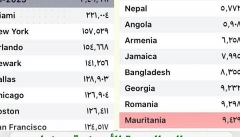 أظهرت معطيات لمصالح الهجرة الأمريكية، دخول 9429 موريتاني للأراضي الأمريكية منذ مطلع العام الجاري عبر حائط المكسيك. وأظهرت المعطيات أن 2254 منهم يتواجدون في نيويورك. ويتداول من وقت لآخر صورا وفيديوهات لعشرات الشباب الموريتاني في مطار أن التونسي متجهين إلى الولايات المتحدة الأمريكية.