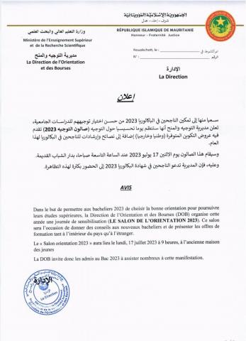 دعت مديرية التوجيه والمنح بوزارة التعليم العالي الناجحين في الباكلوريا هذا العام لحضور صالون توجيهي ستقدم فيه عروض التكوين المتوفرة وطنيا وخارجيا إضافة إلى نصائح وإرشادات لصالح الناجحين في البكالوريا لهذا العام. وأوضحت أن هذا الصالون يوم الاثنين 17 يوليو 2023 عند الساعة التاسعة صباحا، بدار الشباب القديمة. وقالت إن …
