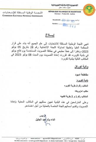 أعلنت اللجنة المستقلة للانتخابات، أنه ونظرا لخطإ مطبعي في بطاقة التصويت المستخدمة يوم فاتح يوليو في بلدية تكوبره، وبناء على قرار المحكمة العليا وتطبيقا لمداولة اللجنة الانتخابية رقم 28 بتاريخ 05 يوليو 2023، فقد تقرر إعادة التصويت في بعض مكاتب البلدية يوم السبت 08 يوليو 2023. وقالت اللجة إن المكاتب …