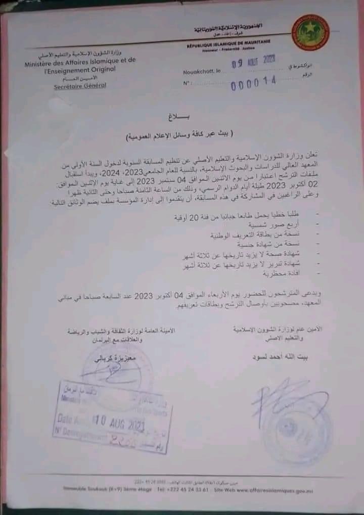 أعلنت وزارة الشؤون الإسلامية والتعليم الأصلي عن تنظيم المسابقة السنوية لدخول السنة الأولى من المعهد العالي للدراسات والبحوث الإسلامية، ومسابقة دخول السنة الأولى من المحظرة الشنقيطية الكبرى في أكجوجت بالنسبة للعام الجامعي 2023، 2024. وأوضحت الوزارة في بلاغ صادر عنها، أن استقبال ملفات الترشح اعتبارا من يوم الإثنين الموافق 04 …