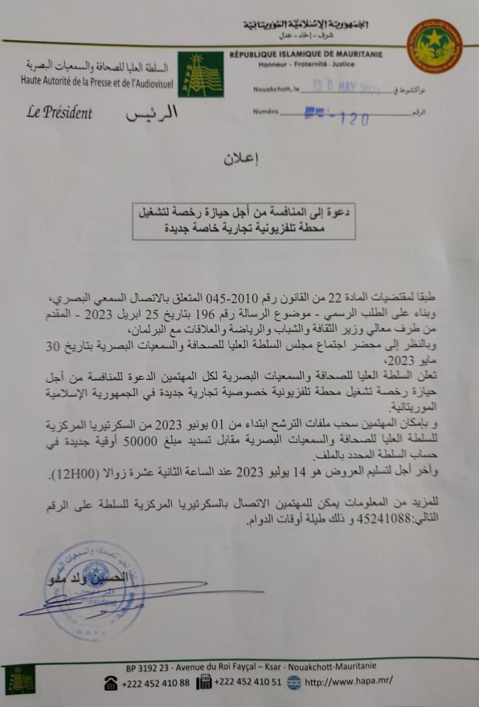 أعلنت السلطة العليا للصحافة والسمعيات البصرية “الهابا”، عن فتح باب المنافسة من أجل حيازة رخصة قناة تلفزيونية تجارية خاصة. وبحسب الإعلان الصادر عن الهابا، فإن فتج باب المنافسة، جاء بناء على رسالة من طرف وزير الثقافة والشباب والرياضة والعلاقات مع البرلمان، كوجهة للسلطة. ووفق الإعلان، “بإمكان المهتمين سحب ملفات الترشح …