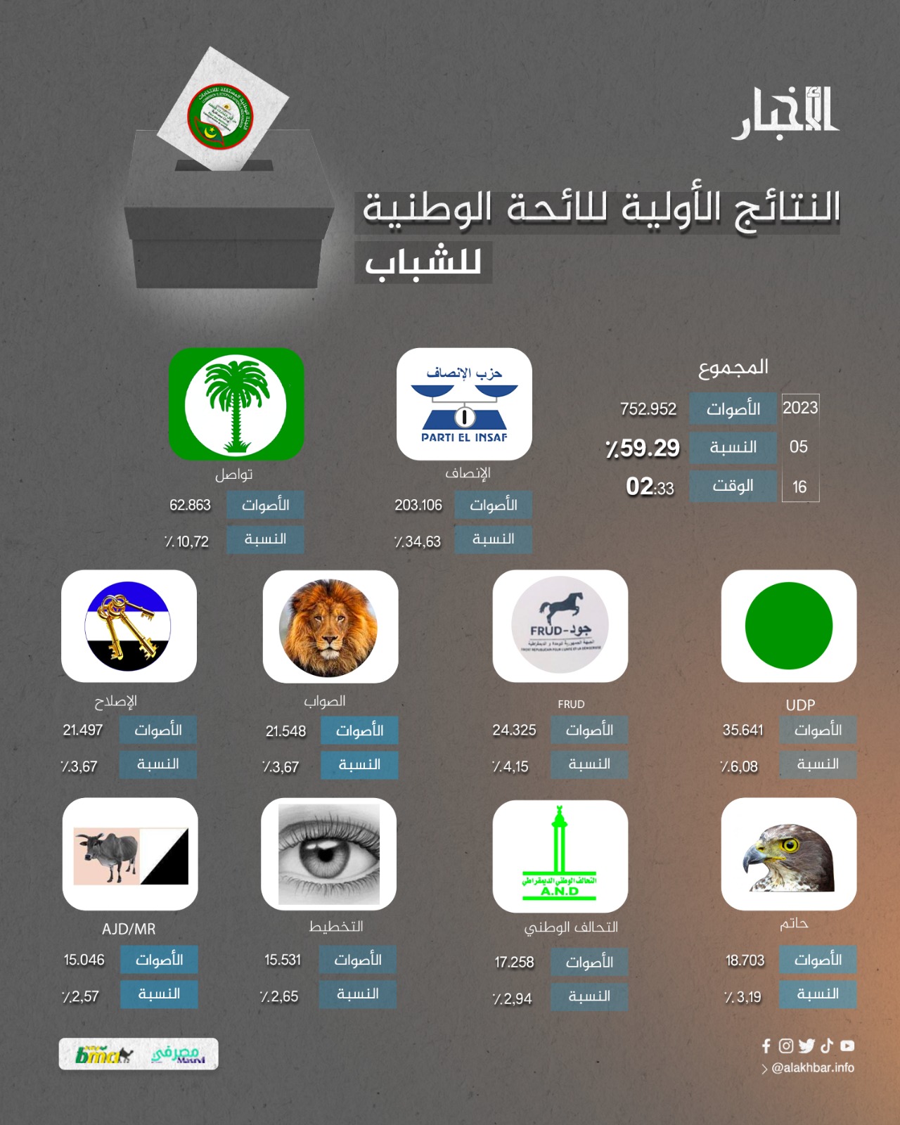 أظهرت نتائج اللائحة الوطنية للشباب تفوق حزب الإنصاف الحاكم على بقية الأحزاب بنسبة: 34.63% بحصوله على 203.106 صوتا، وذلك بعد فرز نسبة 52.04% من مكاتب التصويت (2839 مكتبا) وجاء في الرتبة الثانية حزب التجمع الوطني للإصلاح والتنمية “تواصل” بحصوله على 62.863 صوتا، أي نسبة: 10.72%، فيما حل ثالثا حزب الاتحاد …