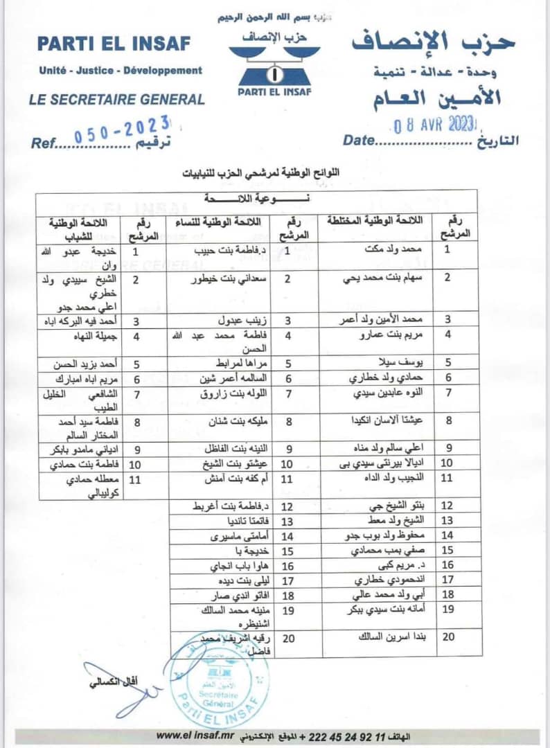 أفرج حزب الإنصاف الحاكم الليلة عن أسماء مرشحيه على اللوائح الوطنية الثلاث، حيث تصدر اللائحة الوطنية المختلطة الفريق المتقاعد محمد ولد مكت، فيما تصدرت اللائحة الوطنية للنساء الوزيرة السابقة فاطمة بنت حبيب. وجاءت على رأس اللائحة الوطنية للشباب خديجة عبد الله وان. وهذه أسماء الخمسة الأوائل في اللائحة الوطنية المختلطة: …