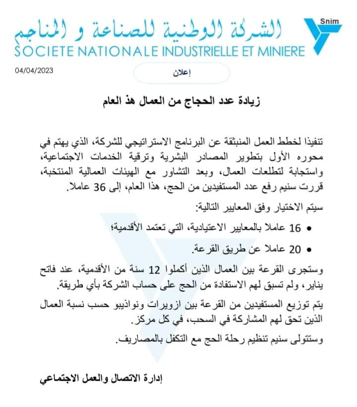 قررت الشركة الوطنية للصناعة والمناجم SNIM رفع عدد المستفيدين من الحج لموسم العام الجاري إلى 36 عاملا، حيث ستتولى الشركة «تنظيم رحلة الحج مع التكفل بالمصاريف». وتكفلت الشركة في عام 2022 الماضي بحج 38 من عمالها، وهو ما يمثل حصة ثلاث سنوات، حيث تم تقييد الحج في موسمين بسبب الإجراءات …