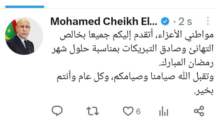 هنأ فخامة رئيس الجمهورية السيد محمد ولد الشيخ الغزواني في تغريدة على حسابه في تويتر، المواطنين بمناسبة حلول شهر رمضان المبارك. وجاء في التغريدة: ” مواطني الأعزاء، أتقدم إليكم جميعا بخالص التهانئ وصادق التبريكات بمناسبة حلول شهر رمضان المبارك. وتقبل الله صيامنا وصيامكم وكل عام وانتم