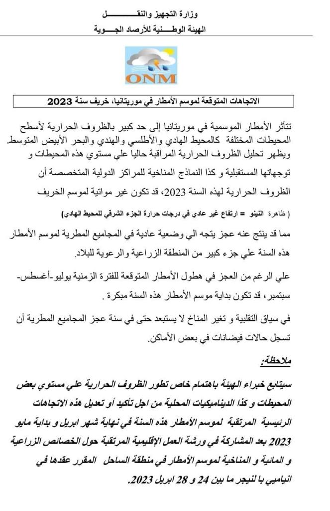 توقعت الهيئة الوطنية للأرصاد الجوية أن تكون بداية موسم الأمطار في موريتانيا لهذا السنة مبكرة، مع توقع عجز في المجاميع المطرية على جزء كبير من المنطقة الزراعية والرعوية في البلاد. وأشارت الهيئة في بيان صادر عنها إلى أنه “لا يستبعد حتى في سنة عجز المجاميع المطرية أن تسجل حالات فيضانات …