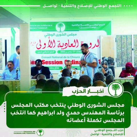 انتخب مجلس الشورى الوطني لحزب التجمع الوطني للإصلاح والتنمية تواصل في جلسته الأولى مساء اليوم الثلاثاء ٢٧ دجمبر مكتب المجلس على النحو التالي: الرئيس: المهندس حمدي ابراهيم النائب الأول خداجة محمد سيديا النائب الثاني ياي انضو كوليبالي النائب الثالث اسحاق ولد الكيحل النائب الرابع يحيى ولد ابوبكر المقرر الأول الشيخ …