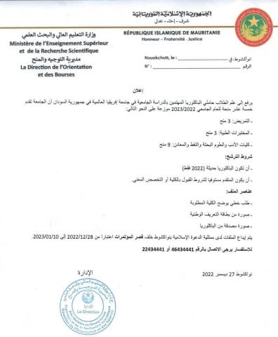 أعلنت وزارة التعليم العالي اليوم عن توفر 15 منحة بجامعة إفريقيا العالمية في جمهورية السودان، لصالح الطلاب الموريتانيين حاملي الباكاوريا 2022. وأوضحت الوزارة في إعلان نشرته أن المنح تتوزع كما يلي : التمريض 3 منح المختبرات الطبية 3 منح – كليات الأدب والعلوم البحتة والنفط والمعادن 9 منح. وأضافت أن …