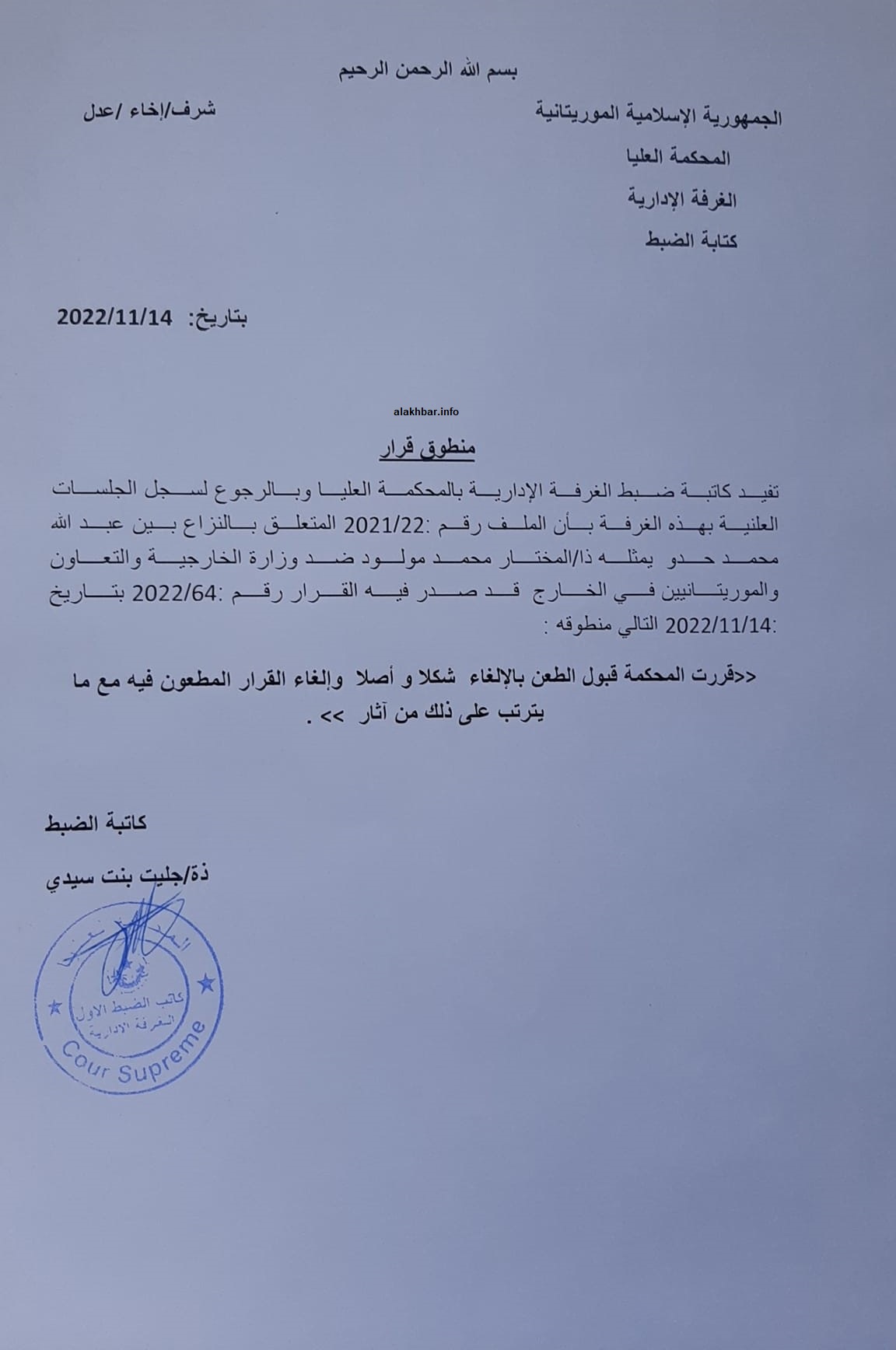 حكمت الغرفة الإدارية في المحكمة العليا أمس الثلاثاء بإلغاء قرار صادر عن وزارة الخارجية، كان الطعن فيه أمام القضاء سببا في إقامة الدبلوماسي والنقابي عبد الله ولد حدو. ووفق منطوق القرار، فقد قررت المحكمة “قبول الطعن بالإلغاء شكلا وأصلا، وإلغاء القرار المطعون فيه، مع ما يترتب على ذلك من آثار”. …