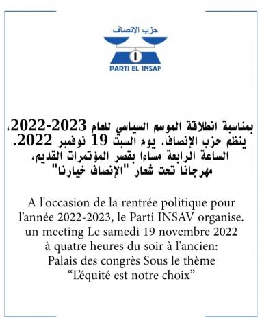 قرر حزب الانصاف الحاكم تأجيل تظاهرة كان يعتزم تنظيمها بعد غد الجمعة، على تمام الساعة الرابعة بقصر المؤتمرات القديم، تحت شعار “الانصاف خيارنا” لإعلان انطلاق موسمه السياسي. وقال الحزب إن التظاهرة ستنظم يوم السبت المقبل في نفس التوقيت والمكان المحددين سلفا.