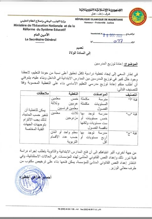 طالب تعميم صادر عن الأمين العام لوزارة التهذيب أحمدو عداهي ولد اخطيرة جميع الولاة ب”اعادة توزيع مدرسي التعليم الأساسي بناء على التغطية المحسوبة”، وفق جدول مرفق بالتعميم. وقسم التعميم الصادر اليوم الخميس المدارس الابتدائية إلى ثلاث مستويات مدرسة مكتملة يغطي حاجتها “خمسة معلمي عربية، وثلاثة معلمي فرنسية، ومدرسة غير مكتملة …
