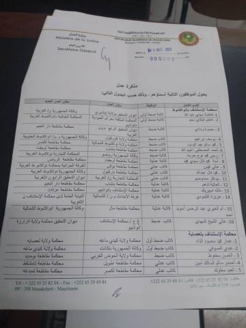 أصدر الامين العام لوزارة العدل مذكرة تم بموجبها اجراء تحويلات على مستوى كتاب الضبط وذلك على النحو التالي: محكمة الاستئناف انواكشوط فاطمة سيدعبدالله كاتبة ضبط اولى وكالة الجمهورية ن غ فاطم البكاي حم كاتبة ضبط اولى المحكمة الجنائية ن غ جمبرة ودادي كاتبة ضبط محكمة دار النعيم يوسف ابراهيم كاتب …