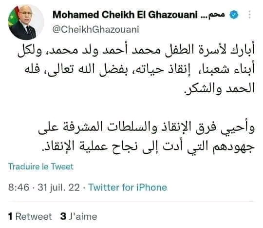 هنأ رئيس الجمهورية محمد ولد الشيخ الغزواني، أسرة الطفل الموريتاني الذي كان عالقا في سد بومديد، على إنقاذ حياته بعد أكثر من 20 ساعة من المحاولات المتتالية لإنقاذه. وأضاف ولد الغزواني في تغريدة على حسابه بتويتر، “وأحيي فرق الإنقاذ والقوات المشرفة على جهودهم التي أدت إلى نجاح عملية الإنقاذ”. وكان …