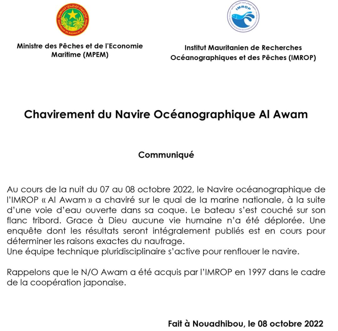 أعلن المعهد الموريتاني لبحوث المحيطات والصيد عن فتح تحقيق في غرق سفينته “العوام” لمعرفة الأسباب الحقيقية وراء الحادث وبنشر نتائج هذا التحقيق للرأي العام. وقال المعهد في بيان أصدره الليلة البارحة إن سفينة العوام انقلبت في البحر على جانبها الأيمن نتيجة دخول الماء إليها حيث كانت متوقفة على رصيف البحرية …