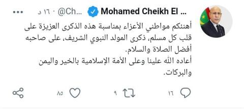 أهنئكم مواطني الأعزاء بمناسبة هذه الذكرى العزيزة على قلب كل مسلم، ذكرى المولد النبوي الشريف، على صاحبه أفضل الصلاة والسلام. أعاده الله علينا وعلى الأمة الإسلامية بالخير واليمن والبركات. رئيس الجمهورية محمد ولد الشيخ الغزواني