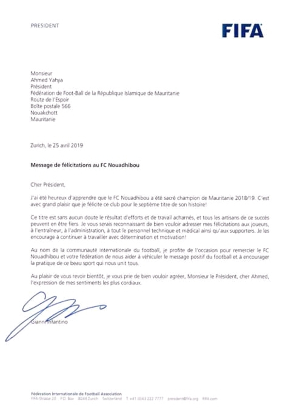 هنأ جياني إنفانتينو، رئيس الاتحاد الدولي لكرة القدم، نادي نواذيبو على تتويجه بلقب الدوري الموريتاني للموسم الثاني على التوالي. و بحسب موقع كووورة فقد جاء ذلك في رسالة بعث بها رئيس الفيفا إلى رئيس الاتحاد الموريتاني، أحمد ولد يحيى، أبلغه خلالها تهانيه للبرتقالي على التتويج الجديد. وكان نواذيبو قد توج …