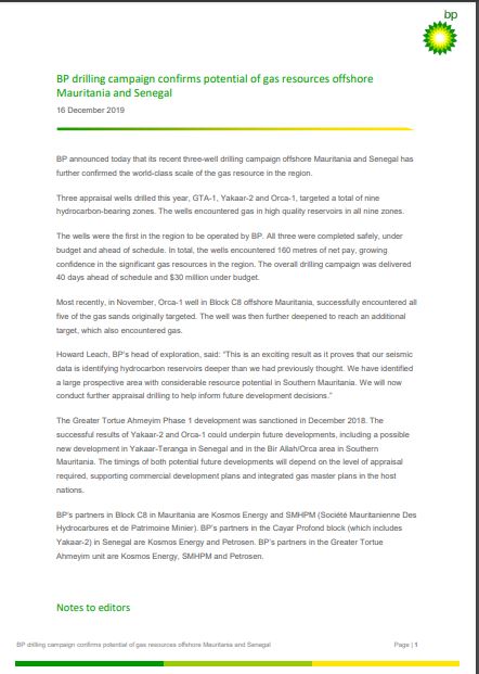 أعلنت شركة بريتش بترليوم (BP) البريطانية اليوم الاثنين أن حملتها الأخيرة لحفر ثلاثة آبار تقييمية قبالة ساحل موريتانيا والسنغال أكدت على “المستوى العالمي للموارد الغازية في المنطقة”. وأوضحت الشركة في بيان نشرته على موقعها الرسمي أن عمليات الحفر أجريت في تسع مناطق وتم العثور فيها جميعا على مؤشرات بوجود …