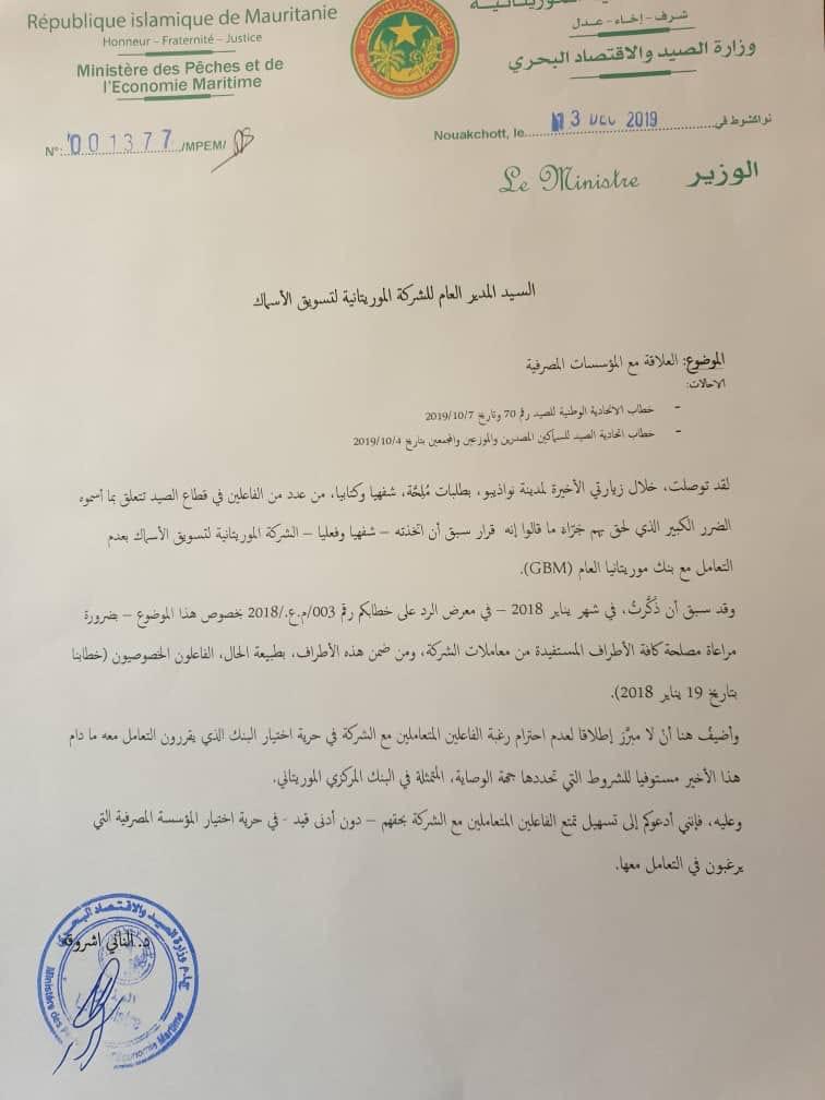 أعلنت وزارة الصيد الموريتانية رفضها حظر التعامل مع بنك موريتانيا العام المملوك لرجل الأعمال الموريتاني محمد ولد بوعماتو. وقال وزير الصيد في وثيقة وجهها لمدير الشركة الموريتانية لتسويق الأسماك، إنه تلقى طلبات من الفاعلين في قطاع الصيد تتعلق بما أسموه “الضرر الكبير الذي لحق بهم جراء ما قالوا إنه …