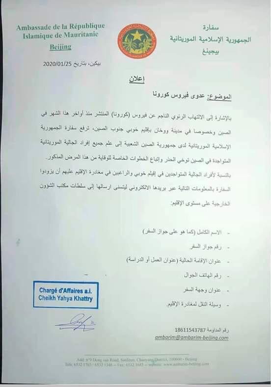 دعت السفارة الموريتانية في الصين، أفراد الجالية الموريتانية إلى توخي الحذر واتباع الخطوات الخاصة للوقاية من فيروس “كورونا” الذي انتشر منذ شهر في الصين. وقالت السفارة في بيان لها، إن على أفراد الجالية الموريتانية المقيمين في إقليم “خوبي” جنوبي الصين والراغبين في مغادرة الإقليم إلى تزويد السفارة بمعلوماتهم عبر …